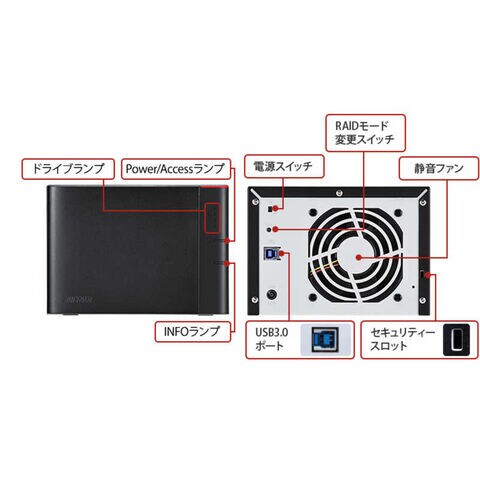 仕様2:[対応しているモード]RAID 5/10/1/0、通常モード、スパニング ※出荷時はRAID5に設定されています。[電源]AC100V 50/60Hz[最大消費電力]90W[エネルギー消費効率(2011年4月改定)]R5:N区分0.0015[グリーン購入法(2011年4月改定)]対応[RoHS基準値]準拠[動作環境]温度5~35°C、湿度20~80% ※結露なきこと