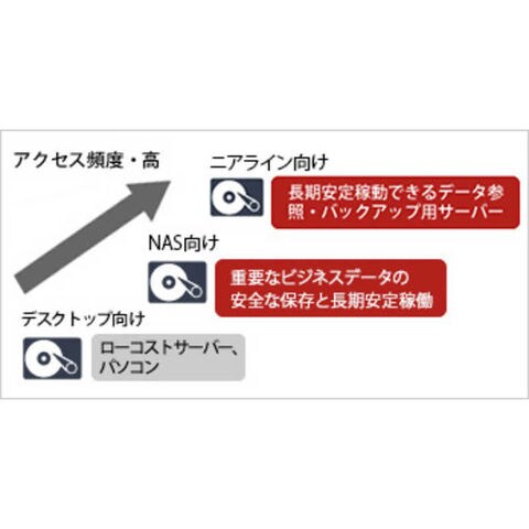 ニアラインHDDとは、通常のデスクトップ向けや、NAS専用HDDに比べ、耐振動性に優れ、低エラーレート、高速レスポンスに対応し、高品質部材による長寿命を実現したHDDです。