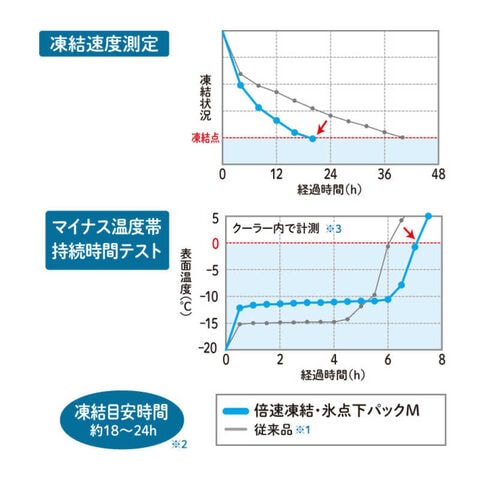 一般的な保冷剤の約8倍の保冷能力をキープしつつ、凍結時間が約18~24時間(※1)と従来品の約半分に。