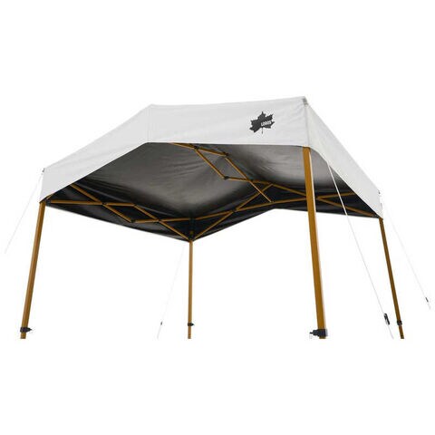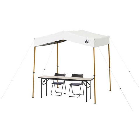 雨水を左右に流す切妻屋根を採用し、前後の入り口への雨だれを軽減する構造のタープ。