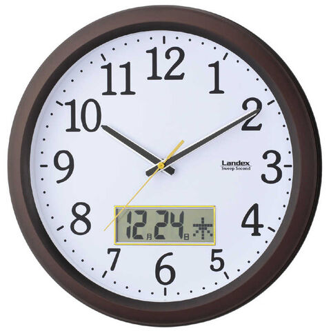 日付と曜日を表示するデジタルカレンダー付きの掛け時計秒針の音がコチコチならない、静かな連続秒針機能:連続秒針、フルオートカレンダー電源:単3型乾電池×2本本体サイズ:(約)高さ32.5×幅.32.5×奥行き5.0cm