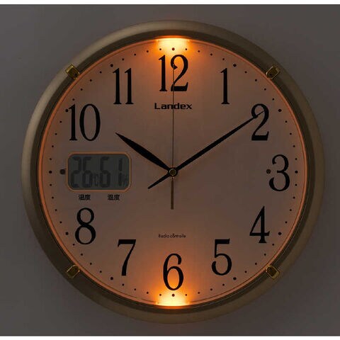 機能:電波受信機能(自動受信、手動受信)、温度表示、湿度表示、常時点灯機能(光センサーにより一定の暗さになったら自動でライトが点灯)、常時点灯の明るさ調整、夜間秒針停止機能(照度センサー)