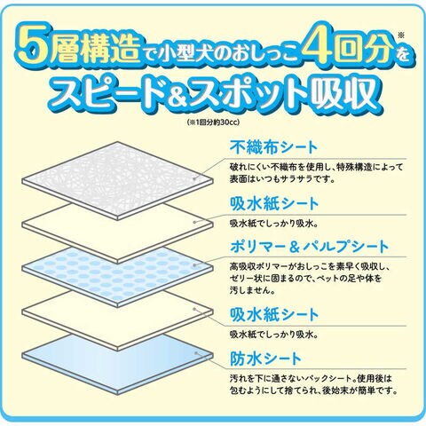 5層構造(不織布シート・吸水紙シート・ポリマー&パルプシート・吸水紙シート・防水シート)で小型犬のおしっこ4回分(1回約30cc)をスピード&スポット吸収。