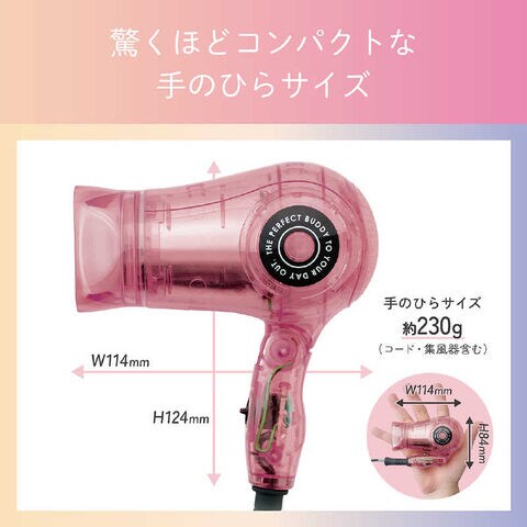 さっと前髪を直したいときにもコンパクトに折りたためる手のひらサイズ約230g(コード・集風器を含む)スケルトンカラーのミニドライヤー”ポケドラ”・電源:AC100V 50/60Hz・消費電力:700W・風量:0.55立米/分・安全装置:温度ヒューズ 152℃・温風温度:約115℃(周囲温度30℃の場合)・毛髪巻込み防止機構:○・メインスイッチ:ON-OFF・サイズ:約114(W)×60(D)×124(H)mm(集風器付)・折りたたみ時サイズ:約114(W)×60(D)×84(H)mm(集風器付)・質量:約230g(集風器付)・コードの長さ:約1.2m・付属品:集風器
