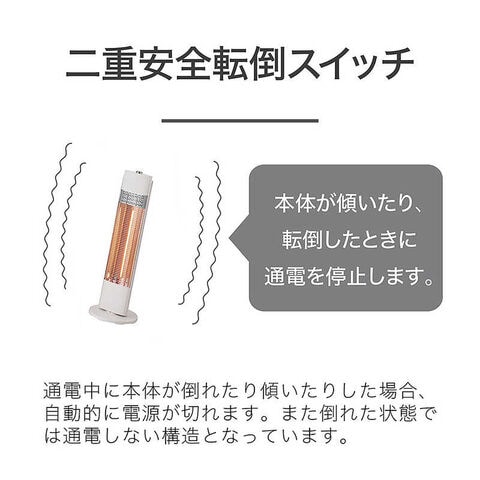 ●安心の二重転倒スイッチと5時間自動オフ、2年保証・消費電力:900W・電力切換スイッチ:300/500/700/900W・コード長:約1.8m・二重安全転倒スイッチ:◯(内蔵)・本体サイズ:約280(W)×280(D)×850(H)mm・本体質量:約2.5kg