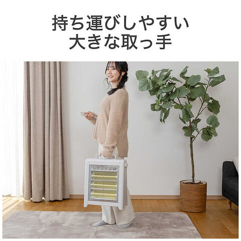●持ち手つきで、コンパクトな電気ストーブ 幅34×奥17×高45cm、重さ2.4kgで持ち手もついているので、お部屋の移動なども楽々です。