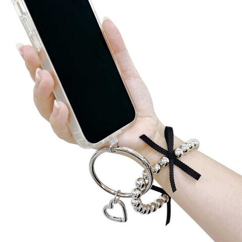 ●メタルビーズのハンドストラップに腕を通して落下防止に
