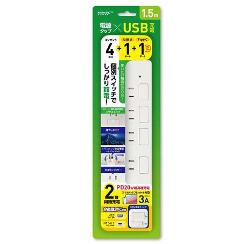 HIDISC HIDISC 電源タップ1.5m USB-Aポート1個口 USB type-Cポート1個口付き [1.5m /4個口 /スイッチ付き(個別) /2ポート] HDTAC4CA20WH