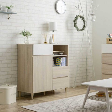 A4サイズが入る引出しや可動棚付きのオープン収納と扉付き収納が付いており、本や雑誌、紙類・文房具などを整理して収納できます。