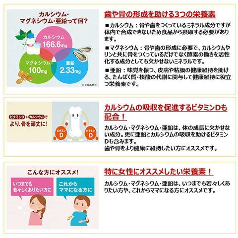 ●3粒にカルシウム500mg、マグネシウム250mg、亜鉛7mgを含有