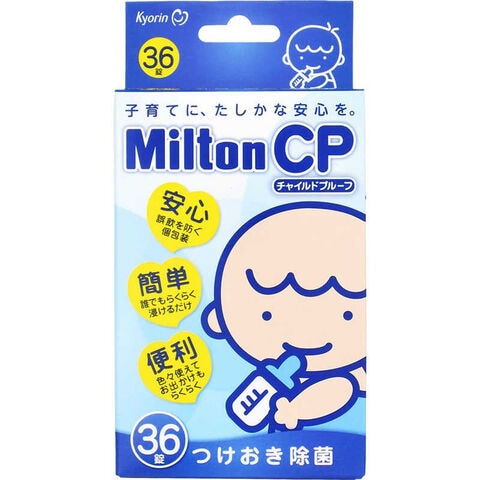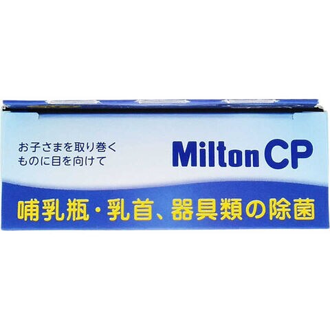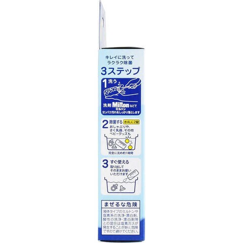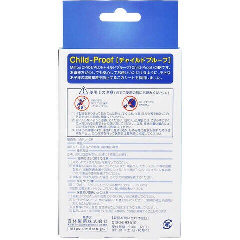 乳幼児がいたずらしても手では切れにくい安心シート(チャイルドプルーフシート)を採用。水4LにMilton CP2錠を入れるだけで調製完了。交換の目安は、1日1回。24時間何度でも使えます。哺乳びんなどに残った溶液は、ミルクなどのタンパク質とふれることで、お塩の成分に変わってしまうので、取り出してすぐに使えます。においが気になる時はすすいでからお使いください。また、火を使わないのでやけどの心配がありません。