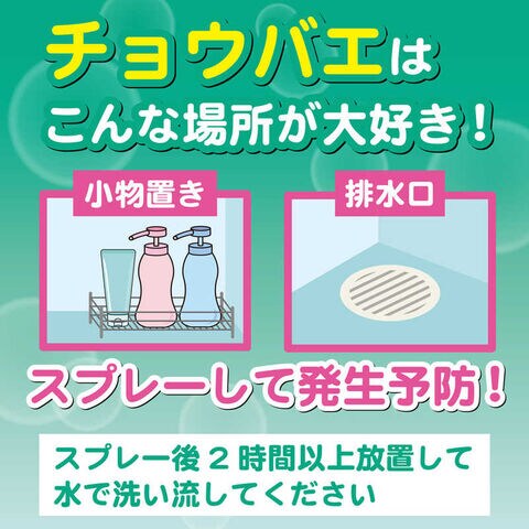 新たなチョウバエを発生予防: 排水口に5回or汚れのたまりやすい所は10回/m2→スプレーして2時間以上放置、その後水で洗い流す。(除菌の場合は4時間以上放置する)