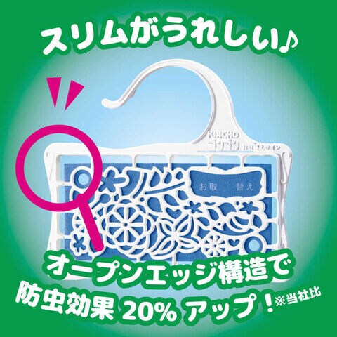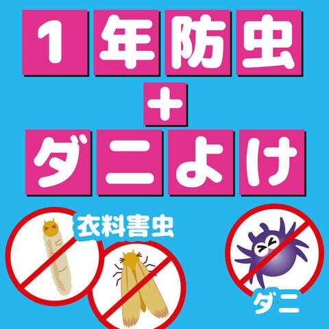 ダニよけ効果をプラスした衣類用防虫剤。洋服ダンス600Lに対して、2個使用が目安。防虫アロマと防虫成分のW効果で、1年防虫。ライムソープの香り。