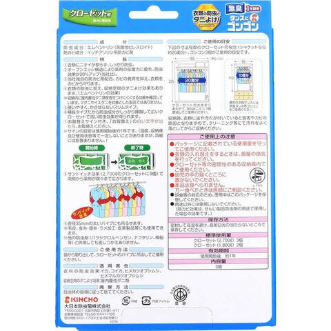 ダニよけ効果をプラスした衣類用防虫剤。クローゼット2700Lに対して、3個使用が目安。無臭でよく効く1年防虫。