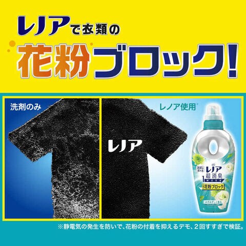 ベタつきもブロック*2夜干し*3 も速乾*4 &消臭1週間ずーっと消臭*5静電気ブロック部屋干しでも生乾き臭を防ぐ洗濯槽のニオイを防ぐ衣類の抗菌*6*静電気の発生を防いで、花粉の付着を抑えるデモ、2回すすぎで検証。