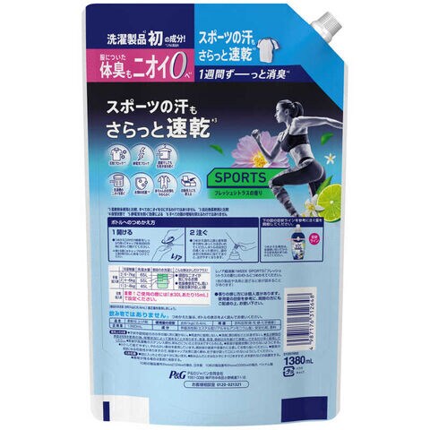 洗濯製品*1初の成分! 服についた体臭もニオイ0へ*2スポーツの汗もさらっと速乾*3 1週間ずーっと消臭*4花粉ブロック*5静電気ブロック部屋干しでも生乾き臭を防ぐ洗濯槽のニオイを防ぐ衣類の抗菌*6赤ちゃんの衣類もやわらかく
