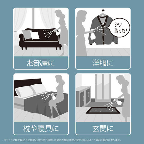 使用方法: 1か所につき2回スプレー後、生地を引っ張って伸ばす。