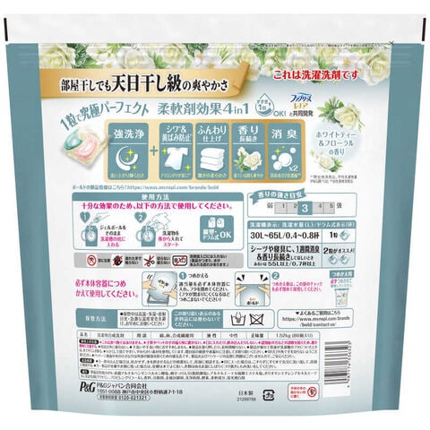 5つ星HOTEL発想 ホワイトティー&フローラルの香り柔軟剤効果 4 in 1強洗浄 洗い上がり輝く白さシワ *1 &黄ばみ防止 *1 アイロンがけが楽に! *1ふんわり仕上げ 驚きの柔らかさ香り長続き 着ている間も華やか消臭成分2倍濃縮 *2