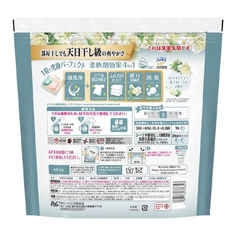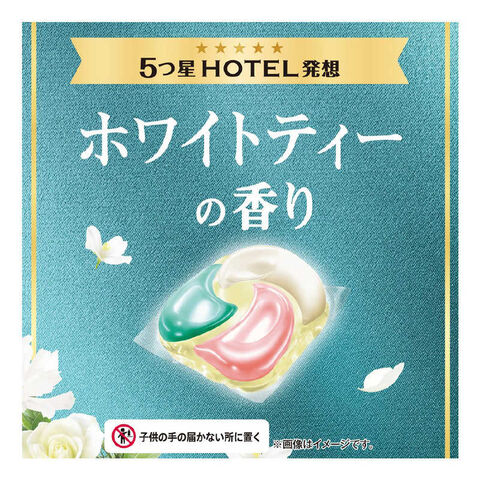 5つ星HOTEL発想 ホワイトティー&フローラルの香り柔軟剤効果 4 in 1強洗浄 洗い上がり輝く白さシワ *1 &黄ばみ防止 *1 アイロンがけが楽に! *1ふんわり仕上げ 驚きの柔らかさ香り長続き 着ている間も華やか消臭成分2倍濃縮 *2*1 弊社他洗剤比、平均洗濯物量(P&G調べ)比