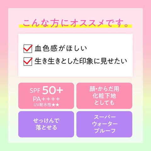 UVカットしながら、色と光をコントロールし、肌をトーンアップ※1。血色感補正ができるローズカラーの顔・からだ用日やけ止め。すーっとのびて、みずみずしい使い心地。SPF50+/PA++++。幸せあふれるハピネスブロッサムの香り。化粧下地にも。 ※1: メイクアップ効果による