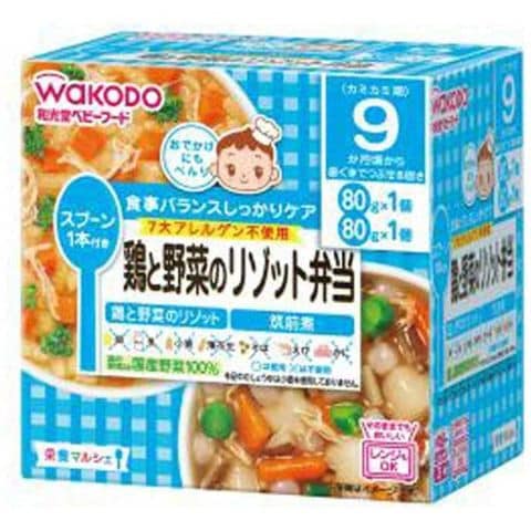 原材料名:[鶏と野菜のリゾット]精白米、鶏ほぐし身、たまねぎペースト、にんじん、チキンエキス、かぼちゃペースト、ぶどう糖、ブロッコリー、チキンブイヨン、食塩、米酢/増粘剤(加工でん粉)