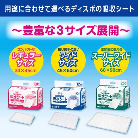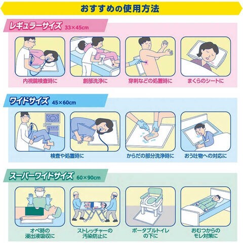 ベッドの上での部分洗浄時の水分吸収や嘔吐物の飛散防止などに。大判タイプの吸水シート