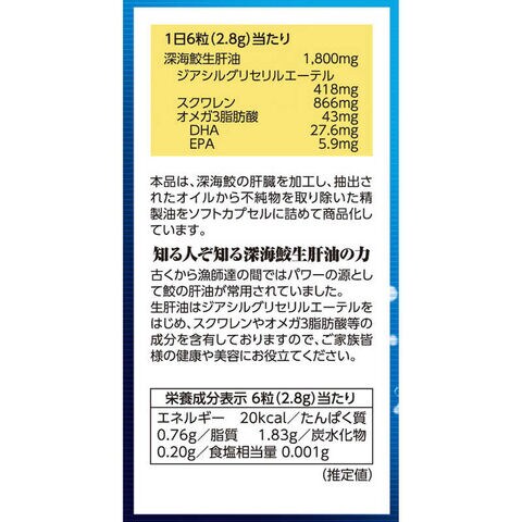 ジアシルグリセリルエーテル、スクワレン、オメガ3脂肪酸含有の生肝油。摂取しやすいソフトカプセルタイプで、美容と健康をサポートします。