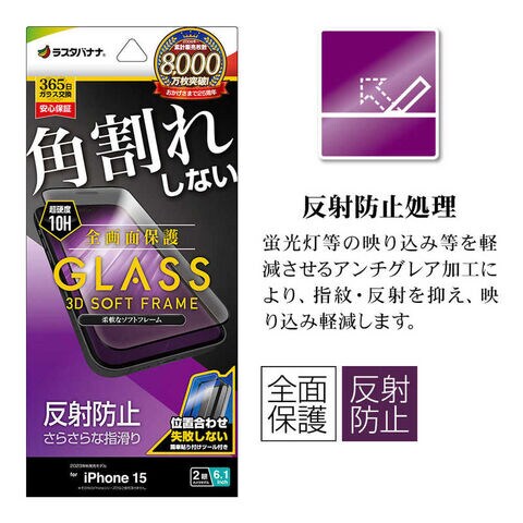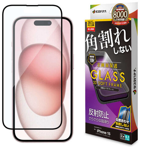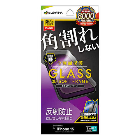 ラスタバナナ iPhone15 6.1インチ ガラスフィルム 全画面保護 角割れしない3Dソフトフレーム 反射防止 簡単貼り付け治具付き