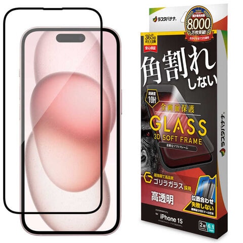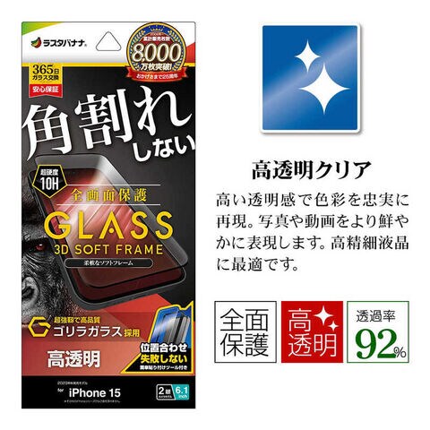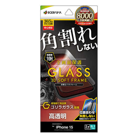 ラスタバナナ iPhone15 6.1インチ ガラスフィルム 全画面保護 角割れしない3Dソフトフレーム ゴリラガラス 高光沢 簡単貼り付け治具付き