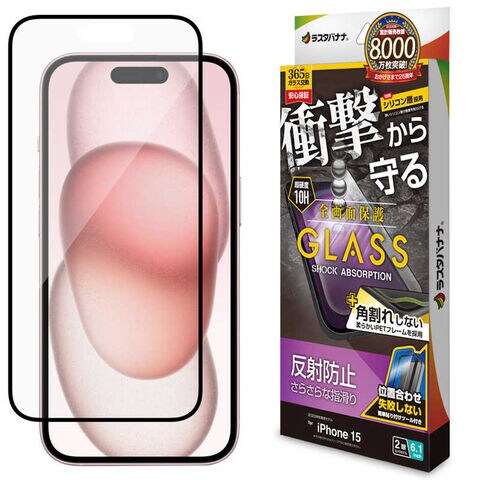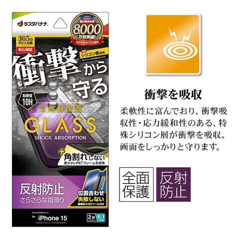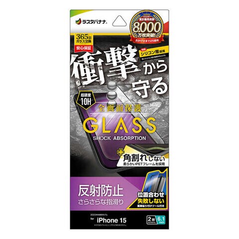 ラスタバナナ iPhone15 6.1インチ ガラスフィルム 全画面保護 衝撃吸収+角割れしない3Dソフトフレーム 反射防止 簡単貼り付け治具付き