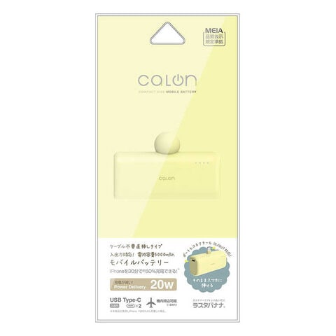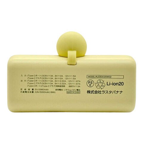 ラスタバナナ calon 5000mAh Type-C直付けモバイルバッテリー Cオス Cメス 20W出力 [USB Power Delivery対応 /2ポート] ライトイエロー RLI050C20W02LYL