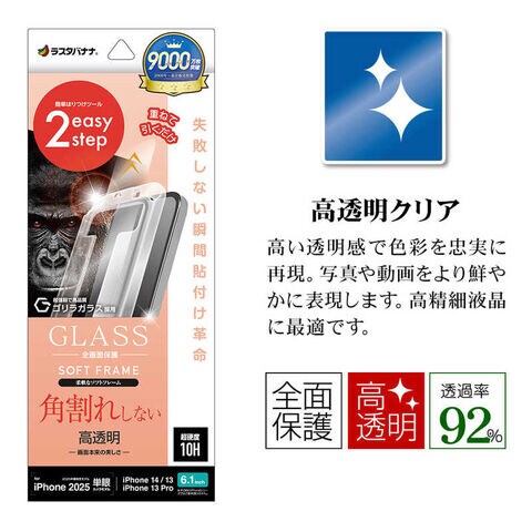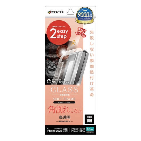 ラスタバナナ iPhone 16e/ 14/ 13/ 13Pro ガラスフィルム 瞬間貼り付け革命 全画面保護 角割れしない ソフトフレーム ゴリラガラス 高光沢 MTK4740IP5E