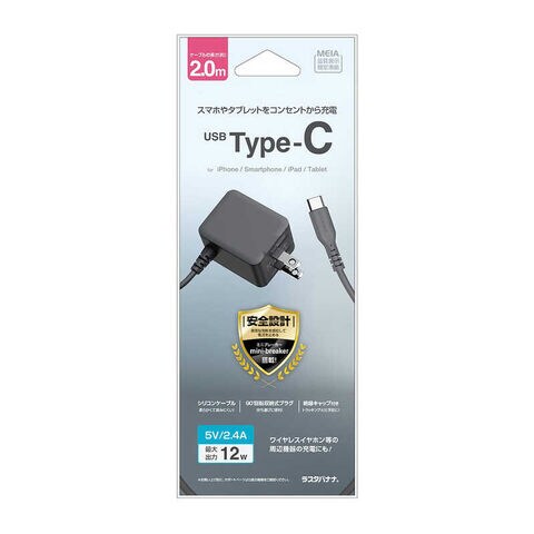 ラスタバナナ AC充電器 タイプC ケーブル直付 mini-breaker付 2.0メートル USB Type-C typec 2.0m iPhone iPad スマホ タブレット チャコールグレー R20ACC2A04CGRY