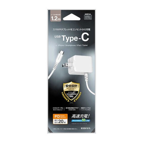 ラスタバナナ AC充電器 タイプC PD パワーデリバリー 20ワット ケーブル直付 mini-breaker付 USB Type-C typec 1.2m iPhone iPad スマホ タブレット ホワイト R12ACC20W03WH