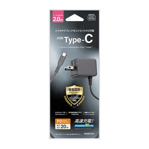 ラスタバナナ AC充電器 タイプC PD パワーデリバリー 20ワット ケーブル直付 mini-breaker付USB Type-C typec 2.0m iPhone iPad チャコールグレー R20ACC20W03CGRYのレビュー