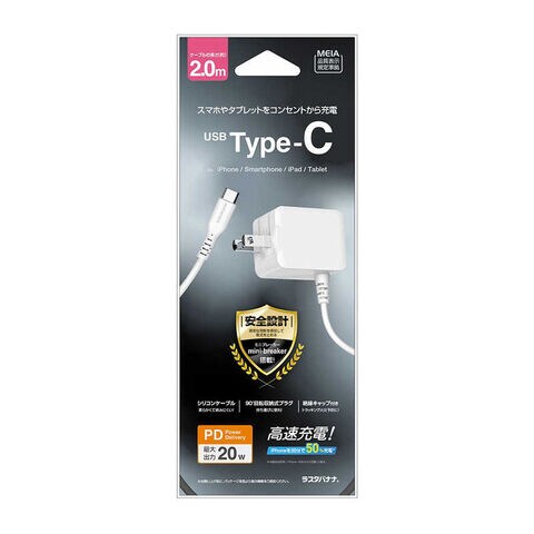 ラスタバナナ AC充電器 タイプC PD パワーデリバリー 20ワット ケーブル直付 mini-breaker付 2.0メートル USB Type-C typec 2.0m iPhone iPad ホワイト R20ACC20W03WH