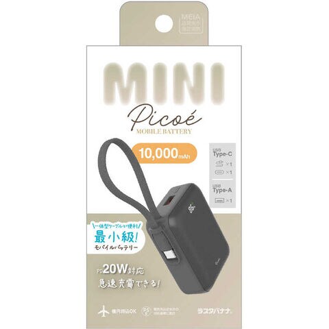 【2026年02月06日発売予定】ラスタバナナ 10000mAh 超小型モバイルバッテリー A×1 C×1 Cケーブル×1 PD20W BK [USB Power Delivery対応 / 2ポート] ブラック RLI100C20W06BK