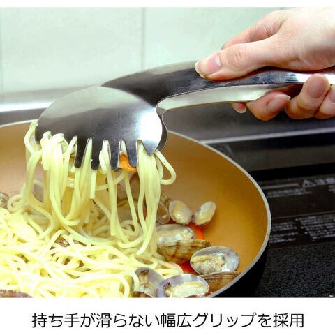 鋭利な先端部をなくし、安全・丸み仕上げを徹底。誰にも使い易く、お子様でもグー握りで使えます。つかみ易さを第一に、持ち手が滑らない幅広グリップ採用。シンプル一体構造でスッキリ・キレイに洗えます。お料理を包み込むようにデザインしたハサミの先端部は、ブレずにしっかり合うので取りこぼしを防止します。大きな両爪で、パスタもスムーズに盛り付けできます。