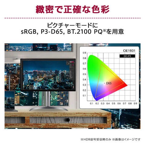 一般的に多く使用される色空間「sRGB」よりも広色域なデジタルシネマ規格「DCI-P3」を98%(標準値)カバー。