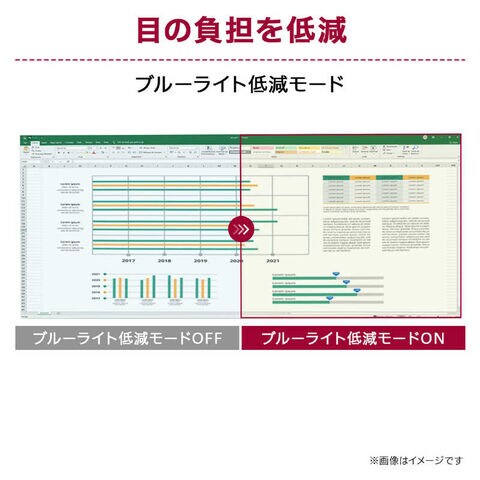 紙に近い色温度で表示することで眼精疲労や生活リズムに影響を及ぼすとされているブルーライトを抑えるブルーライト低減モード、従来のLEDモニターで画面の明るさを抑えた際に発生していた、ちらつきを調光方式を変更することで抑えたフリッカーセーフ機能を搭載しています。