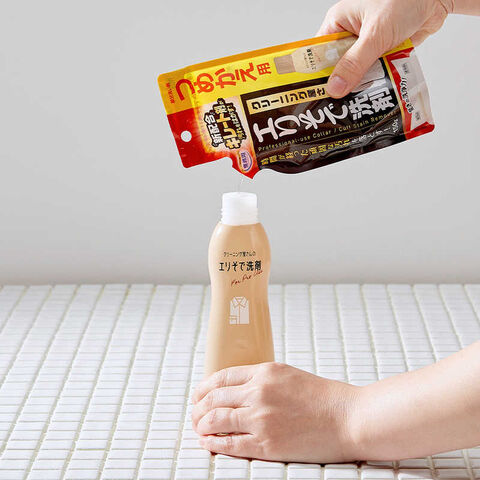 クリーニング業界で実際に使われているエリそで洗剤の詰め替え。