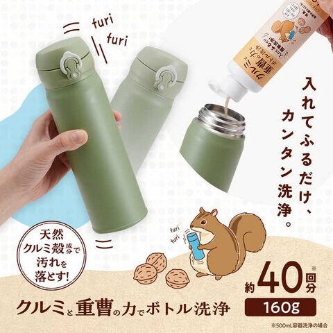 天然クルミ殻成分と重曹のWパワーで、ボトルや調理器具の汚れや臭いをすっきり落とします。