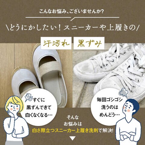 独自処方のホワイトニング剤により、スニーカーや上履きなど白い靴の白さが復活し、よりキレイに見えます。