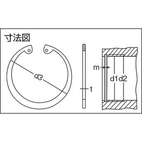 ●呼径:R-37●止め輪(mm)d3:39.8●止め輪(mm)t:1.50●適用する穴(参考)(mm)d1:37●適用する穴(参考)(mm)d2:39.0●適用する穴(参考)(mm)m:1.65●質量(g):10.35