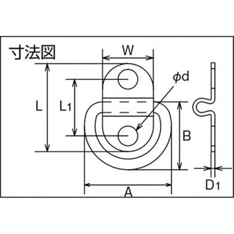 使用荷重(kN):0.15、L(mm):34、B(mm):26、D1(mm):1.2、A(mm):34、d (mm):6.8、W(mm):20、D2(mm):4、