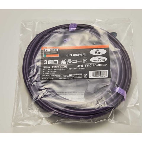 色:バイオレット、電線仕様長さ(m):5、電線仕様太さ(mm[[の2乗]]):2.0、電線仕様芯数(C):2、コンセント仕様定格:15A、コンセント仕様形状:[[ニ相]]、コンセント仕様個数:3、質量(kg):0.64