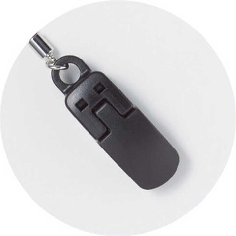 クリップは固定式ではなく可動式で、紐の長さも一般に販売されているものより長めですので、場所を問わず襟元など止めやすい所で留めてご使用頂けます。