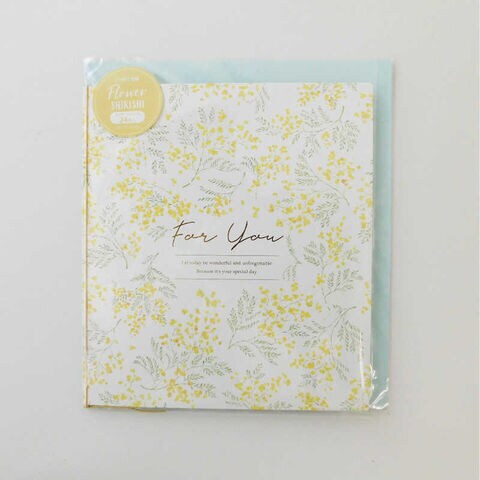 ミモザのイラストが水彩でやわらかく描かれた二つ折りの色紙です。