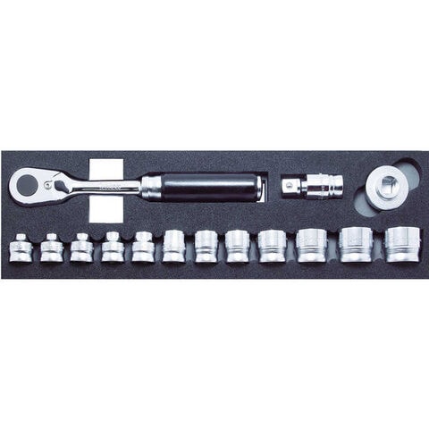 差込角(mm):9.5、ソケット内容(mm):5.5、6、7、8、10、12、13、14、17、19、21、22、ハンドル内容:ラチェットハンドル、ユニバーサルジョイント、クイックスピンナー、セット内容(点):15、ケースサイズ(mm):310×100×40、質量(g):750