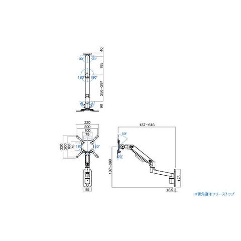 前方20度、後方50度、左右各180度(任意調節可能)※角度調節時、モニターが壁へ干渉する場合、確保できる角度は異なります。